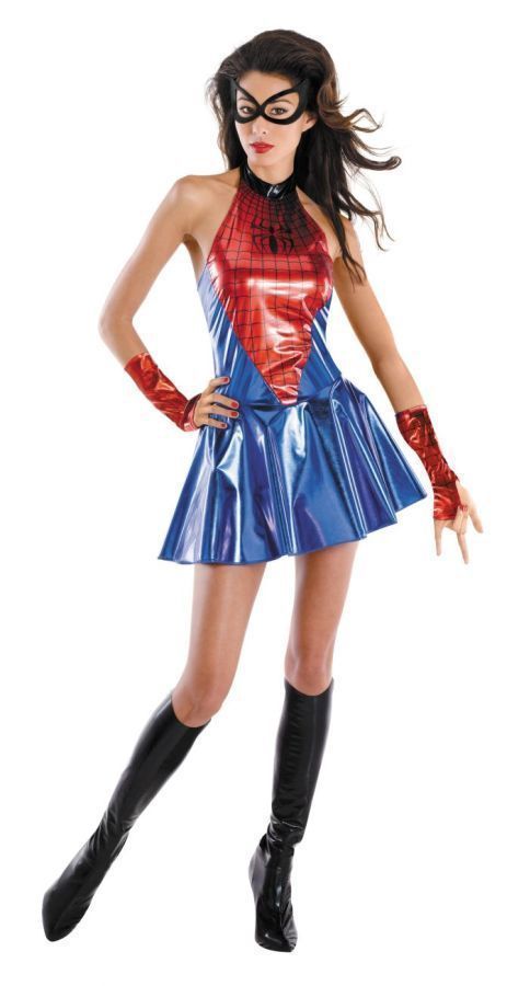 Костюм Спайдергёрл включает в себя сине-красное платье, накладки на обувь, красные перчатки без пальцев и маску на глаза. В таком костюме вы будете прекрасной спутницей Человека Паука на любой вечеринке. Имитация винила.