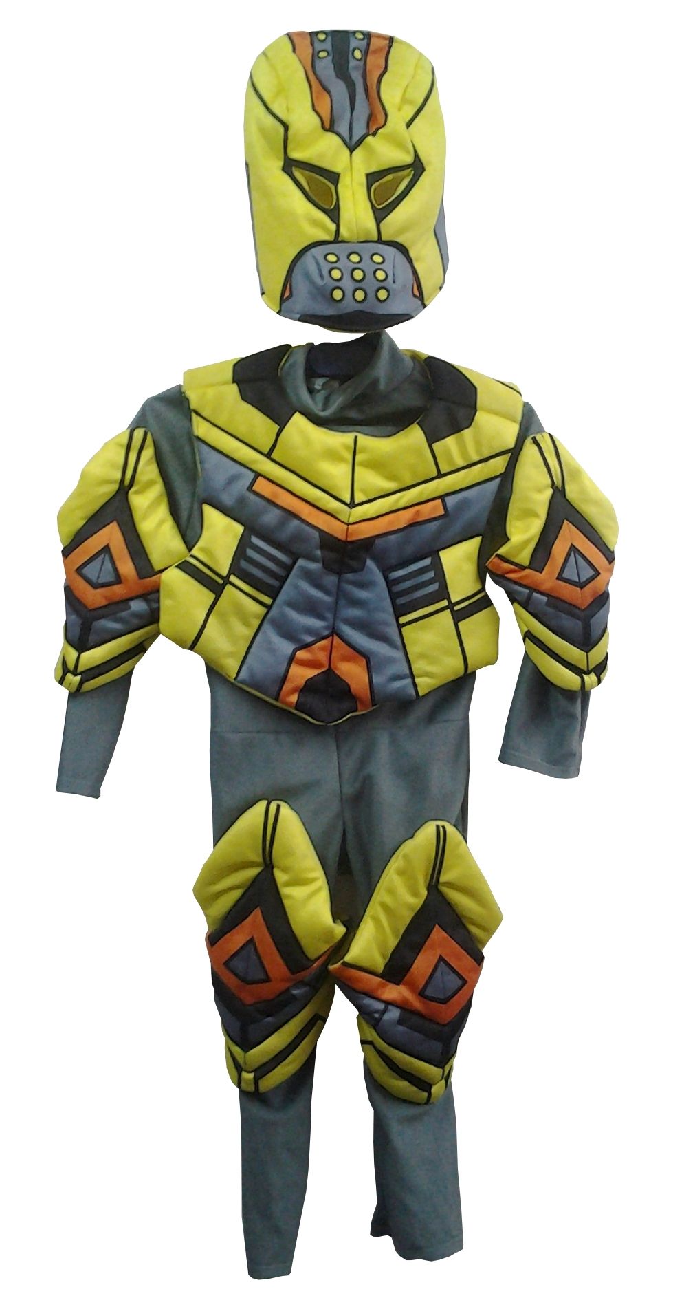 Детский костюм Трансформера выполнен из мягкого серого материала с желтыми вставками. В комплекте штаны, объемная кофта с длинными рукавами и маска на все лицо.