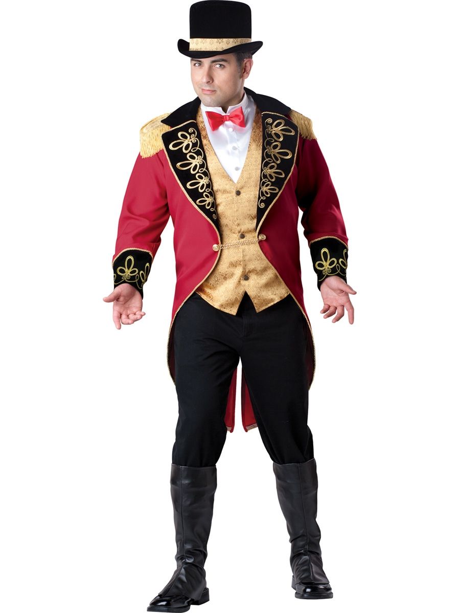 В костюм хозяина цирка входит длинный пиджак с цепочкой-застежкой,  золотистая жилетка, бабочка, цилиндр и сапоги.