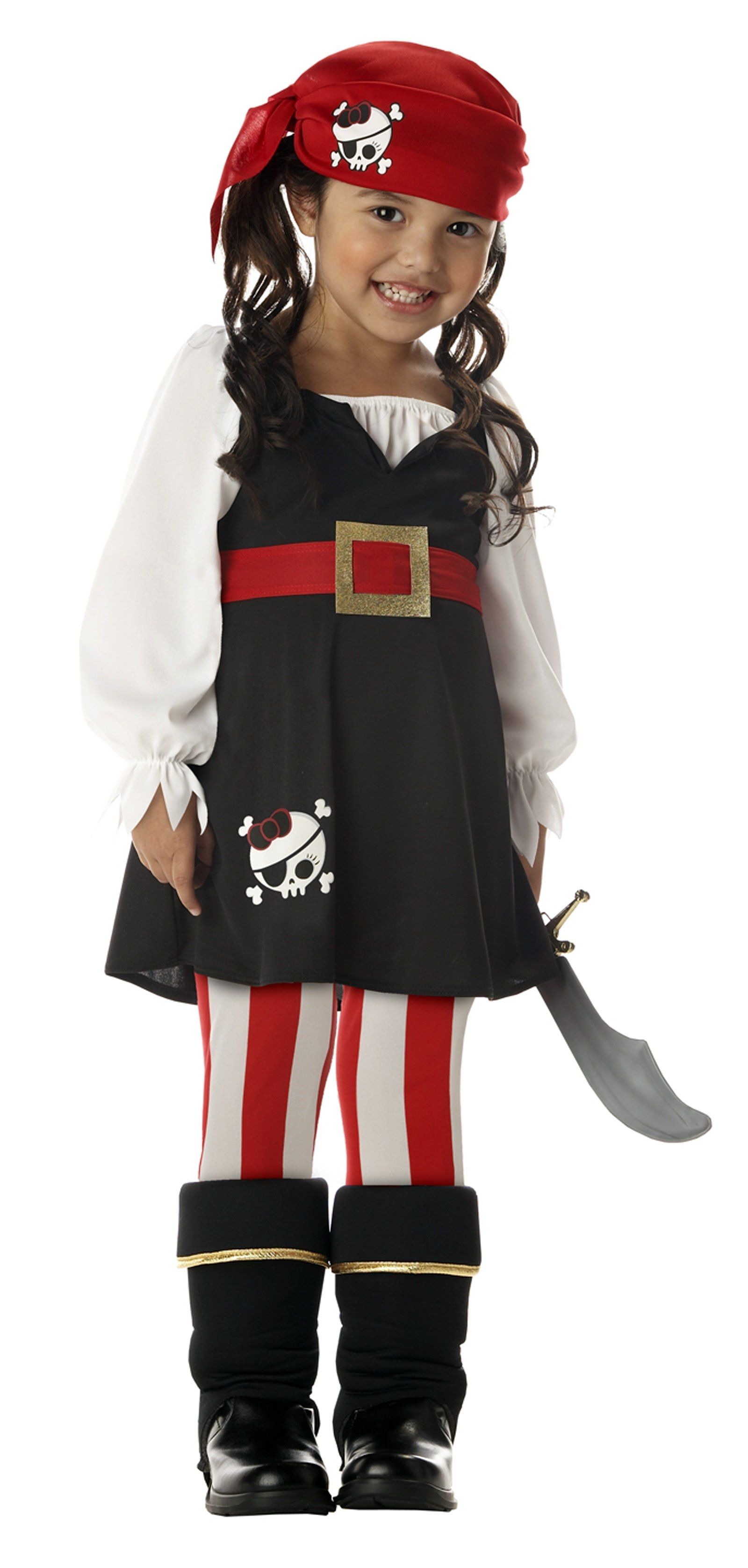 Светлая улыбка не покинет лица вашей девочки, одетой в детский костюм "жизнерадостной пиратки". В костюм входят: платье с ремнем, бандана, колготки с накладками для сапог.