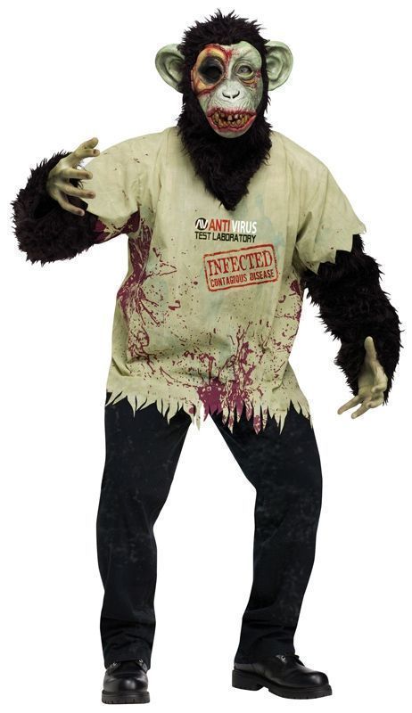 Костюм зомби шимпанзе включает в себя рваную футболку с кровавыми пятнами, маску шимпанзе и плюшевые рукава. Этот костюм можно надевать на карнавал, маскарад и прочие вечеринки для которых требуется костюм или маска. Наряд зомби шимпанзе будет всех забавлять и в тоже время пугать.