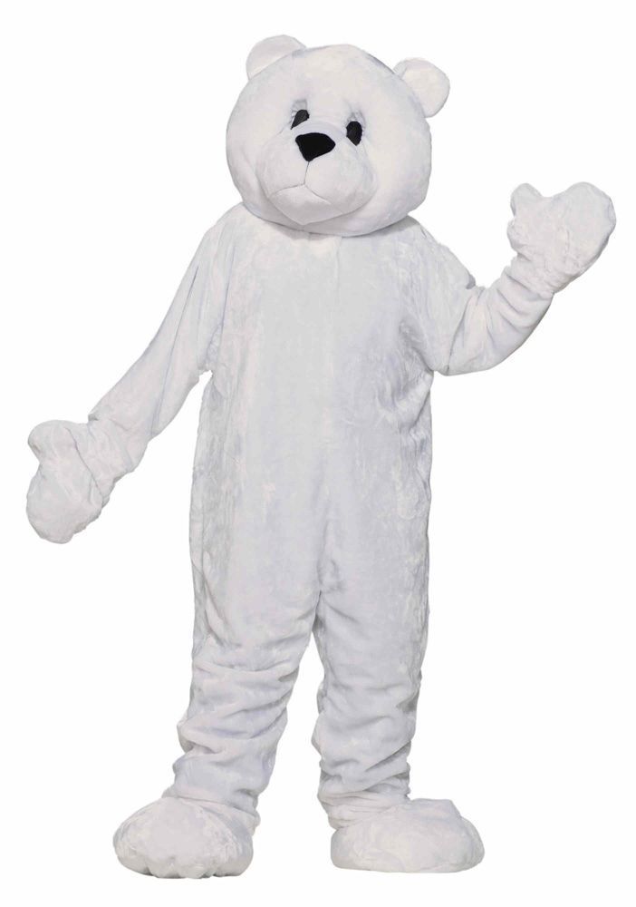 Ростовой костюм полярного медведя выполнен в белом цвете из мягкого материала. В комплект костюма входит комбинезон, перчатки и белые большие лапы на ноги, также имеется большая голова медведя с маленькими ушками, милыми глазками и черным носиком.