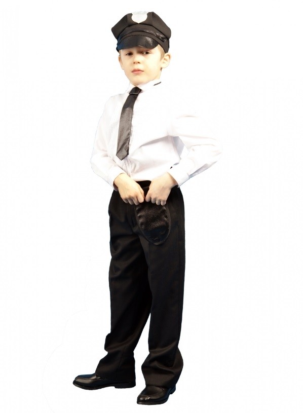 Детский комплект полицейского включает в себя фуражку, черный атласный галстук на резинке и кобуру. Образ можно дополнить белой рубашкой и черными классическими брюками.