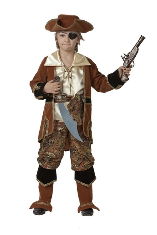Детский костюм капитана корабля. В комплекте: рубаха, камзол, штаны, пояс, шляпа черного цвета, пистолет, меч, повязка на глаз.