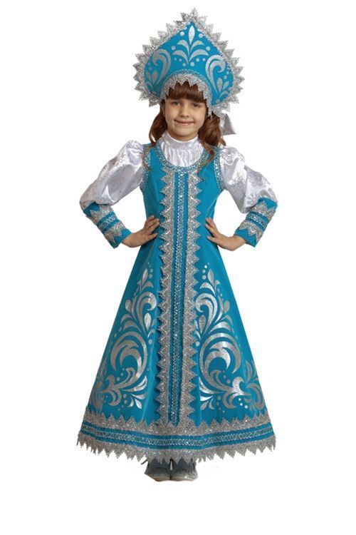 Детский костюм прекрасной Снегурочки включает в себя голубой сарафан с узорами и длинными белыми рукавами, а также голубой шикарный кокошник с серебряными узорами. Этот костюм ваша девочка сможет надеть на Новогодний утренник, для выступления или домашнего праздника.