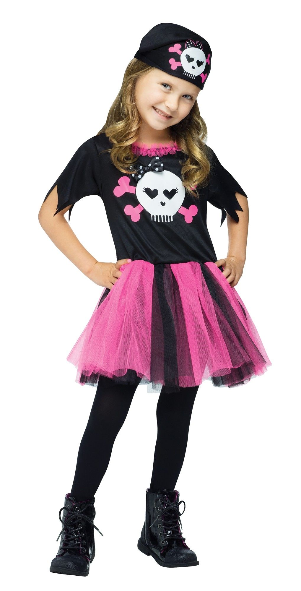 Детский костюм милашки пиратки включает в себя черное платье с пышной розовой юбочкой и изображением черепушки на топе, а также черную бандану с изображением белого мультяшного черепа.