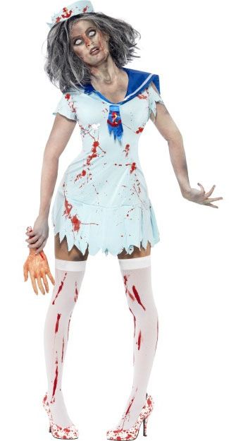 Костюм зомби-морячки включает в себя рваное платье, забрызганное искусственной кровью и шапочку. Подобрав к костюму различные аксессуары и дополнительные вещи, вы сможете полностью закончить свой жуткий образ зомби-морячки. Такой костюм подойдёт для Хэллоуина, Пятницы 13 и других тематических праздников.