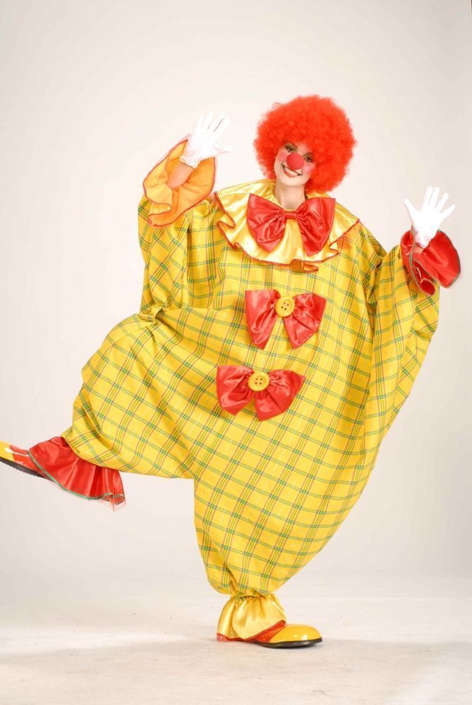 Желтый костюм большого клоуна представляет собой большой клетчатый комбинезон желтого цвета. Комбинезон украшен тремя красными бантиками, манжеты на руках и ногах слегка расклешены. Нос, парик и обувь в комплект не входят. Рассмешите всех на вечеринке своим забавным костюмом!