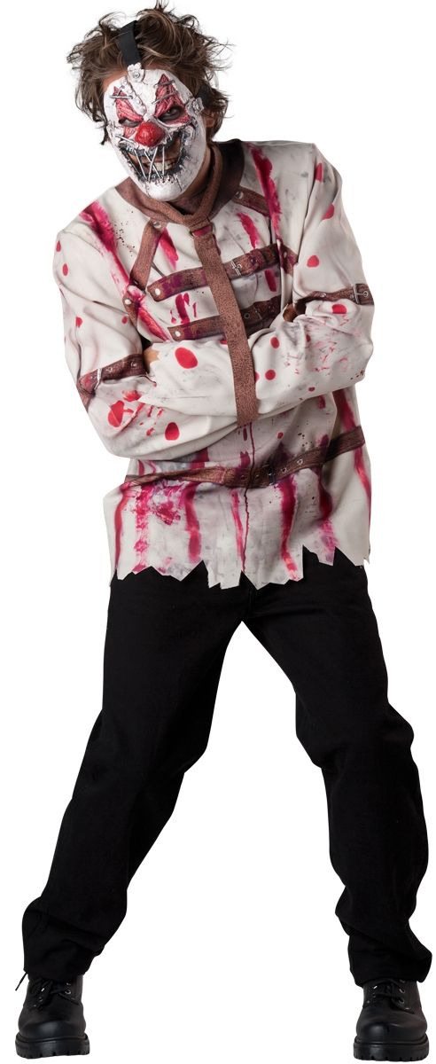 Костюм психа из цирка включает в себя смирительную рубашку, оковы и маску. Создает образ безумного веселья, подходит для праздников со страшной тематикой.