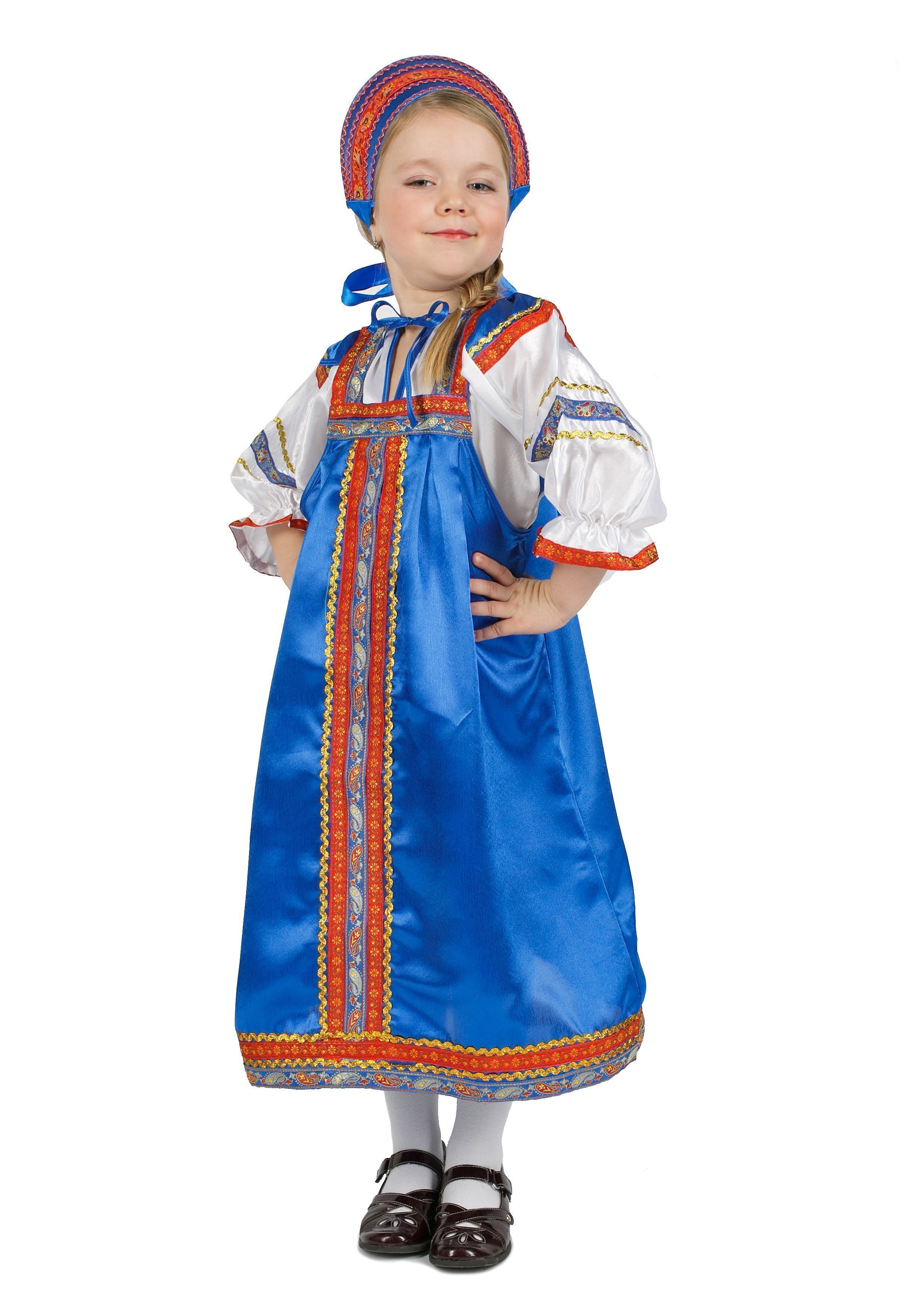 Атласный синий костюм Василиса представляет собой русский народный длинный сарафан, выполненный из блестящего атласного материала. Сарафан отделан декоративной тесьмой с цветочными узорами. Также к нему прилагается белая атласная рубашка.