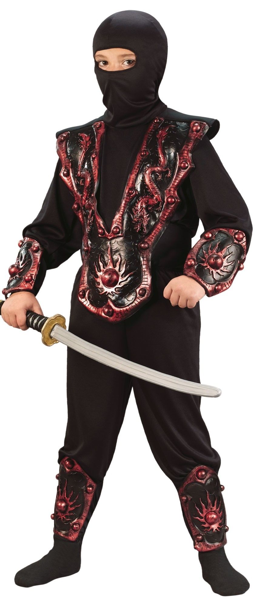 Костюм Ниндзя воина красный 3-D прекрасно подойдет для боевых мальчишек. Костюм включает в себя кофту с длинными рукавами, брюки черного цвета и капюшон, который покрывает голову и пол лица. Костюм дополняет броня на грудь, выполненная в красно-черном цвете. На броне имеются объемные фигуры. Также в комплект входят щитки на ноги и запястья, которые также сочетают в себе красный и черный цвет.