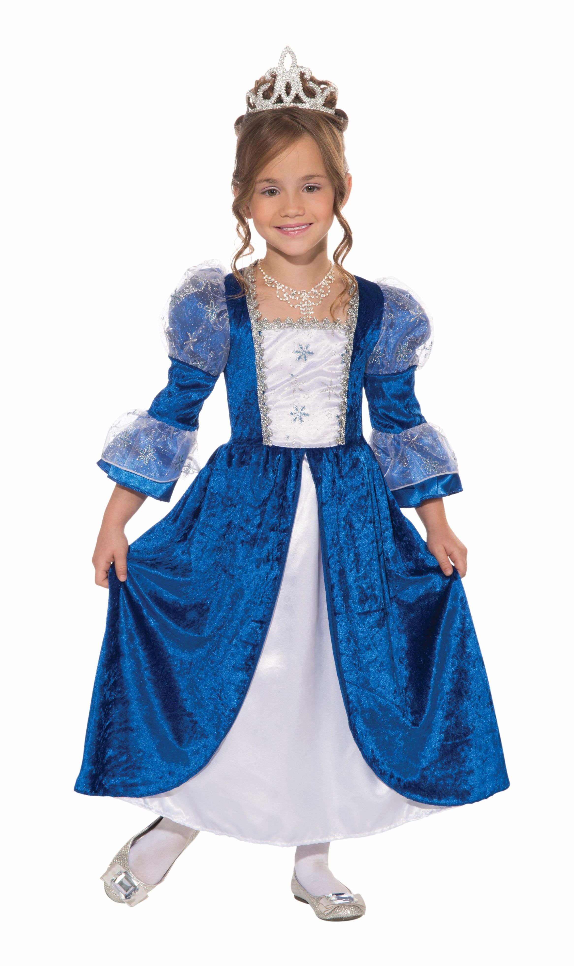 Платье снежной принцессы выполнено из бархатного синего материала. Платье с длинными рукавами и белыми атласными вставками. Серебряная отделка платья придает ему изящества.