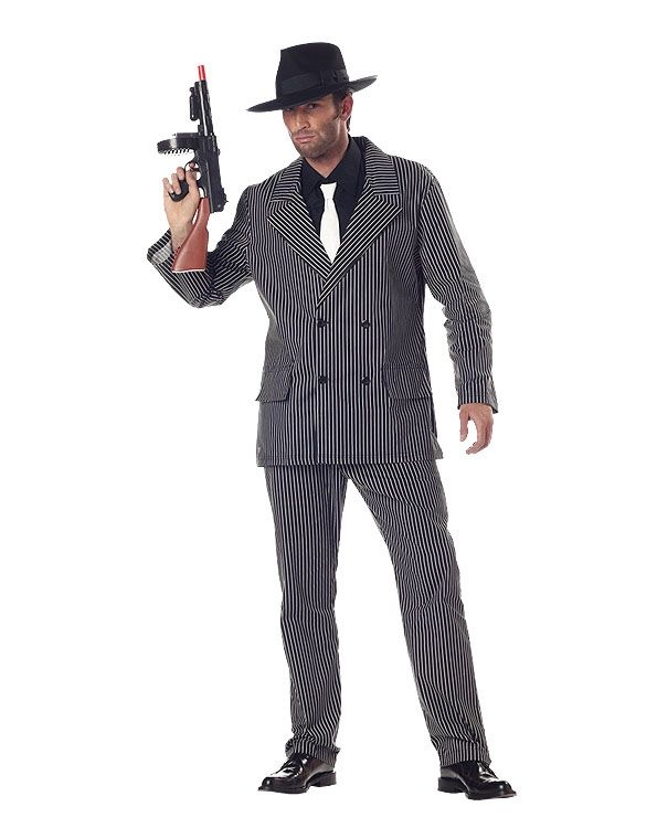Полосатый костюм гангстера выполнен в черном цвете в тонкую белую полоску. В комплект входит пиджак, брюки, а также манишка в виде рубашки с прикрепленным белым галстуком. Шляпа и оружие в комплект не входит, но все это вы можете приобрести отдельно, а также другие аксессуары, дополняющие грозный образ гангстера.
