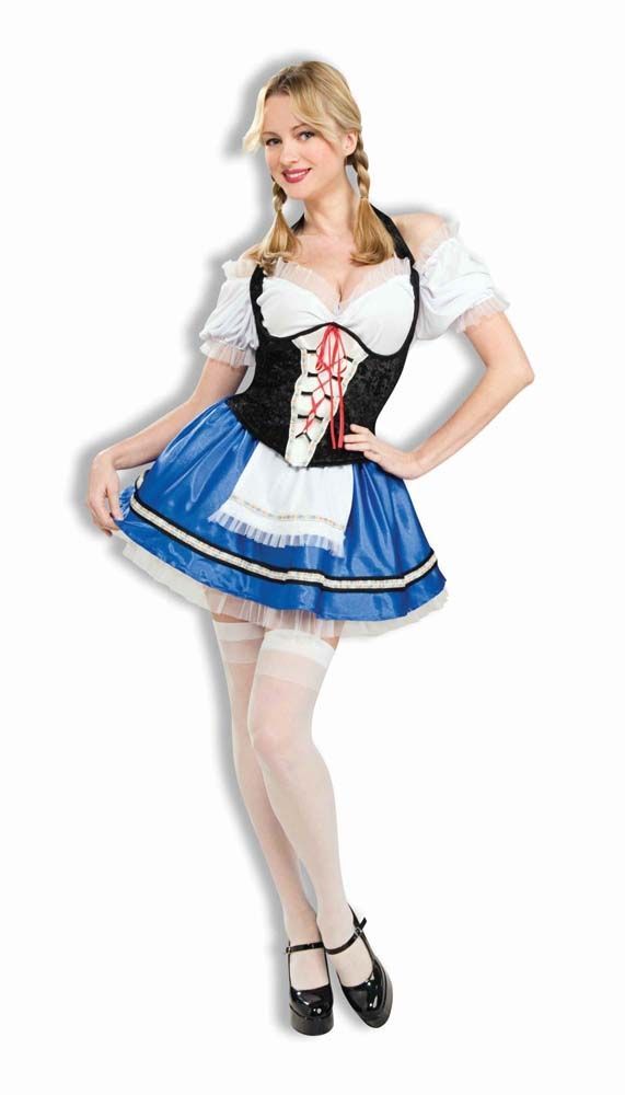 Костюм альпийской девушки Гретель - это милый костюм, который идеально подойдет для Октоберфеста. Костюм включает в себя платье со спущенными рукавами и синей пышной юбочкой, а также черный корсет с передней шнуровкой красного цвета. Чулки и обувь в комплект не входят.