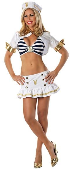 Костюм морячки Playboy включает в себя короткий полосатый топ сине-белого цвета, который по середине украшен бляшкой с якорем, короткую слегка расклешенную юбочку с декоративными пуговицами и изображением кролика, а также морскую шапочку с изображением логотипа  Playboy и белое балеро с короткими рукавами и золотыми манжетами.