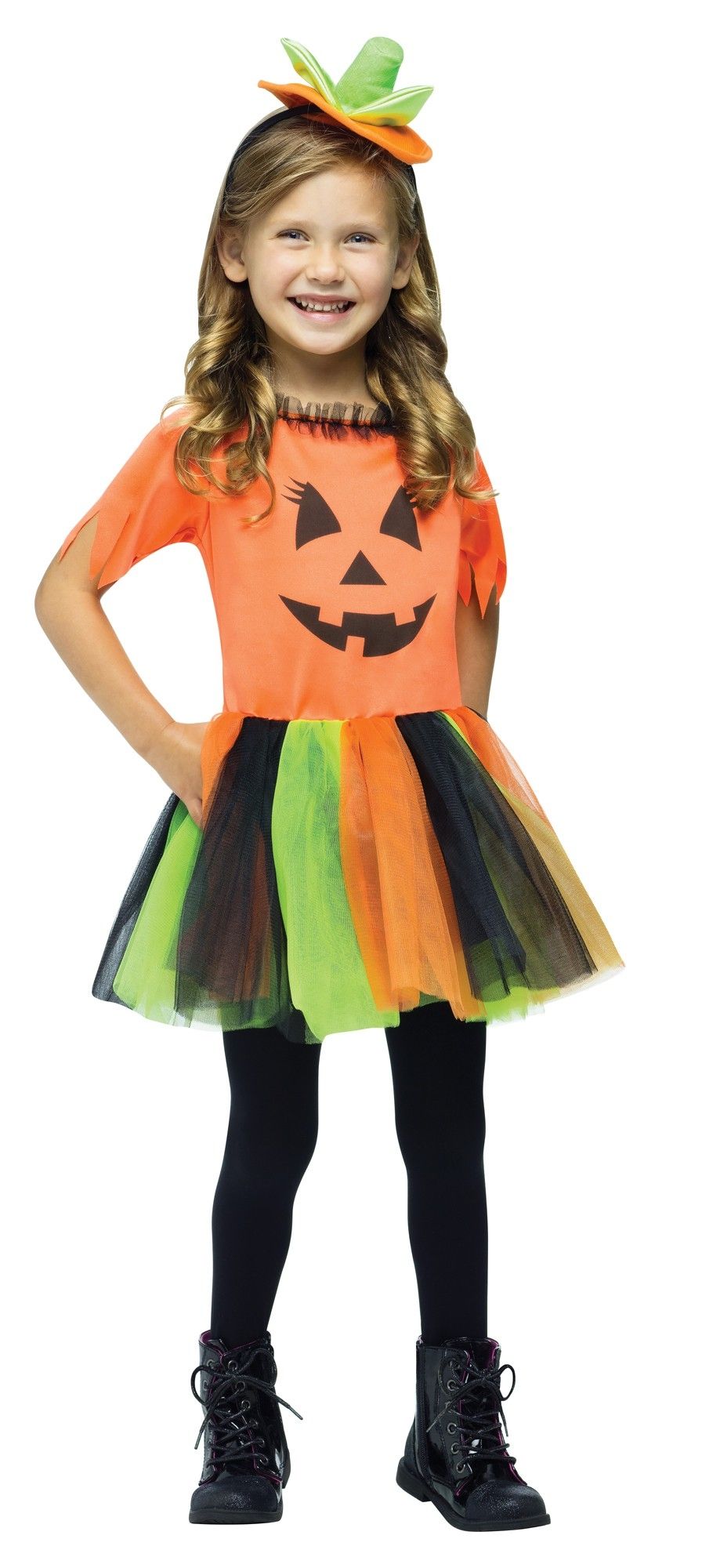 Детский костюм милашки Тыквы включает в себя яркое оранжевое платье с мордочкой Хэллоуинской тыквы и пышной разноцветной юбочкой. Также к платью прилагается яркая мини-шляпка.