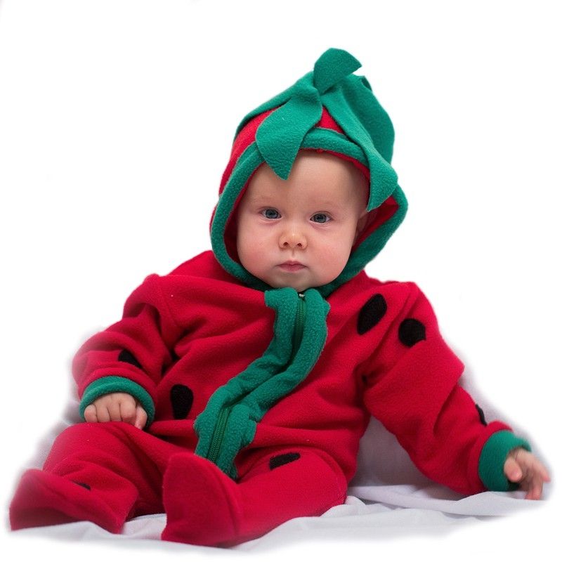Костюм для малышей Клубничка представляет собой комбинезон красного цвета с зеленой отделкой и черными точками. Комбинезон выполнен из флиса. Подходит для малышей 6-9 месяцев.