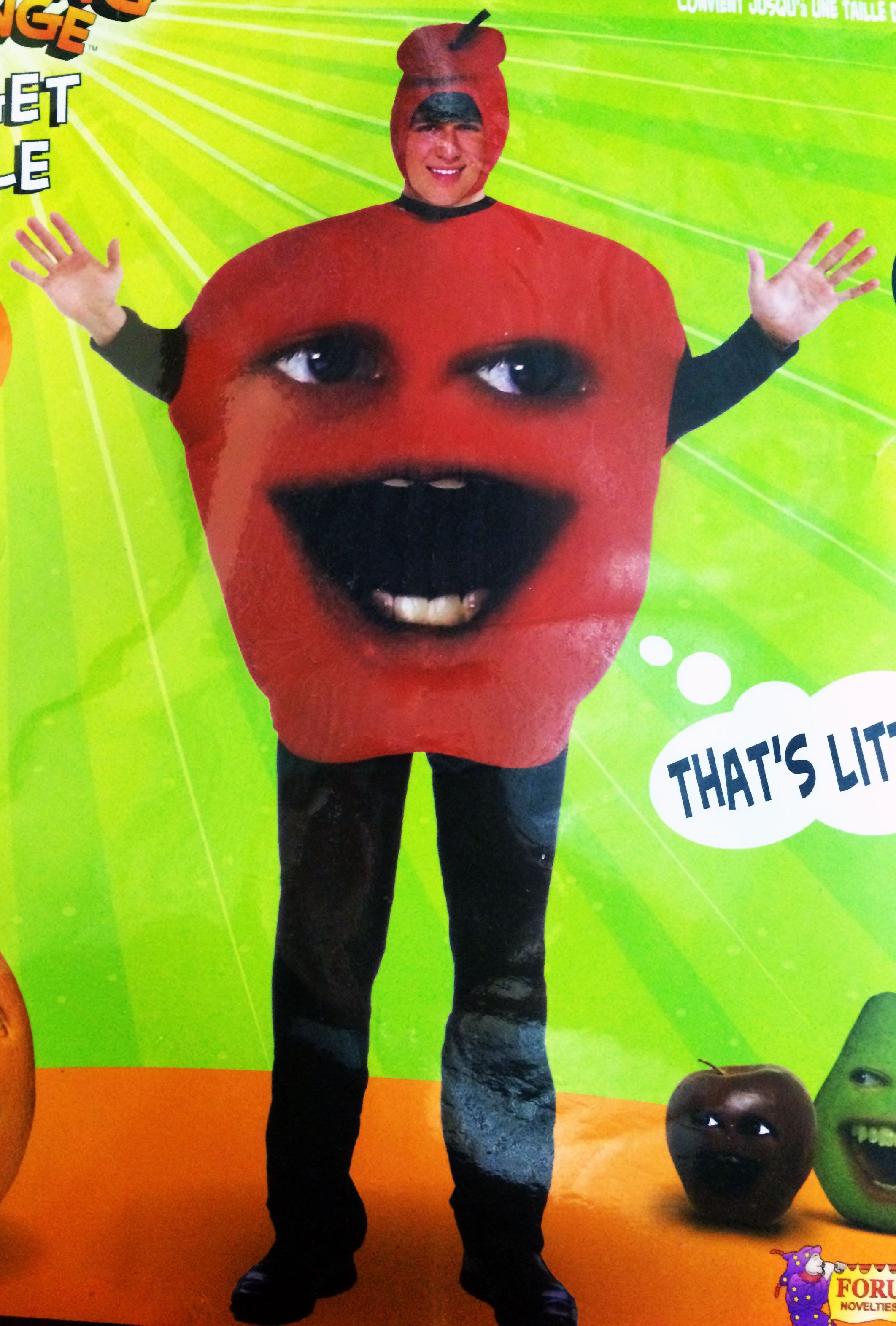 Костюм веселого яблока представляет собой тунику в виде красного яблока из знаменитого сериала про веселые фрукты. На тунике имеется забавное лицо. Также туника украшена зеленым листиком. В ней имеются прорези для головы и рук.