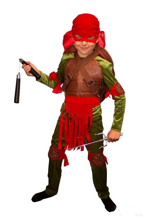 Костюм Ниндзя Черепашки - детский костюм отважной Черепашки, который включает в себя зеленую бархатную кофту, зеленые брюки, коричневый панцирь из искусственного кожаного материала, красную бандану-маску с прорезями для глаз, а также красные повязки на руки и ноги.