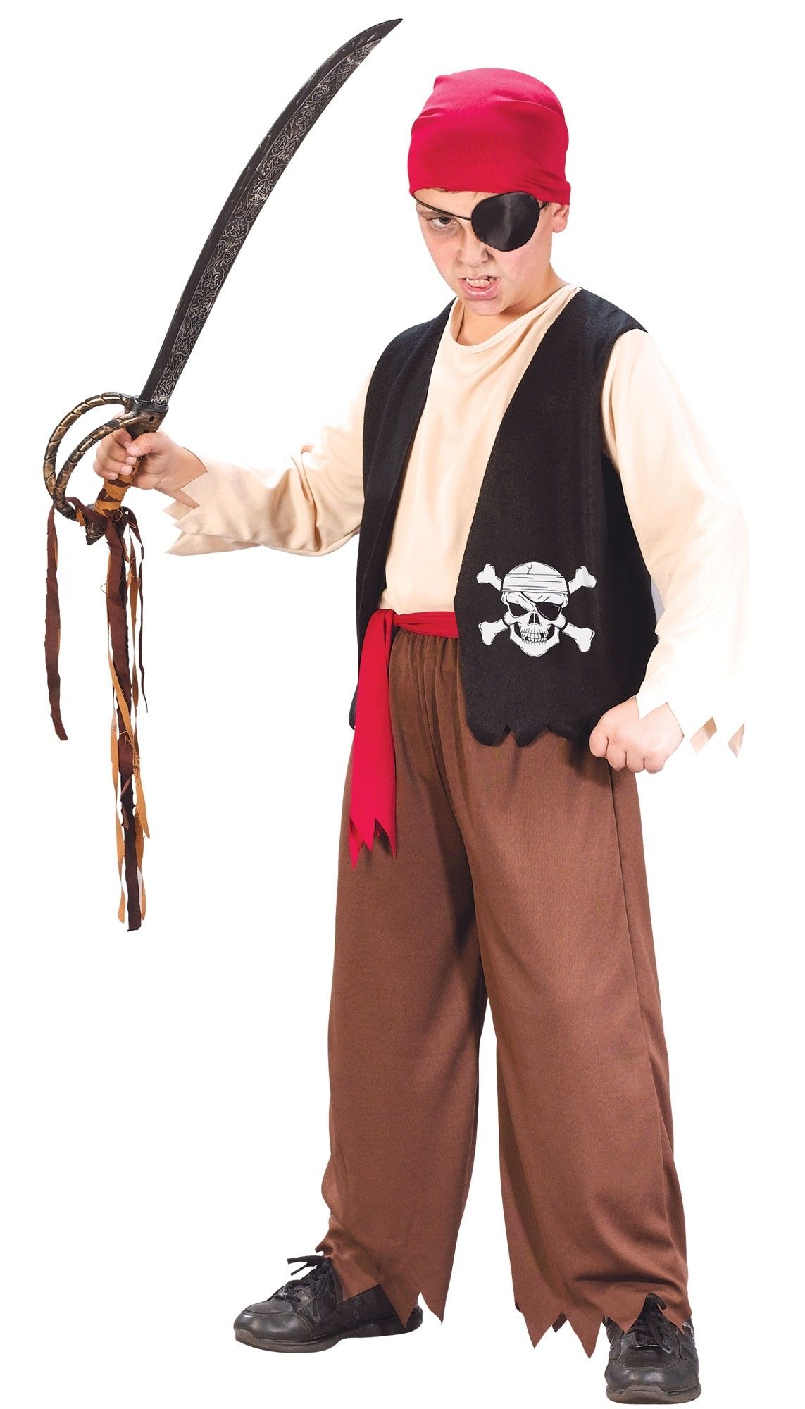 Костюм пирата Рона состоит из рубашки с принтом черепа, пояса, повязки на глаз, штанов и бонданы. Меч в комплектацию не входит. Отличный образ для юных любителей морской романтики.