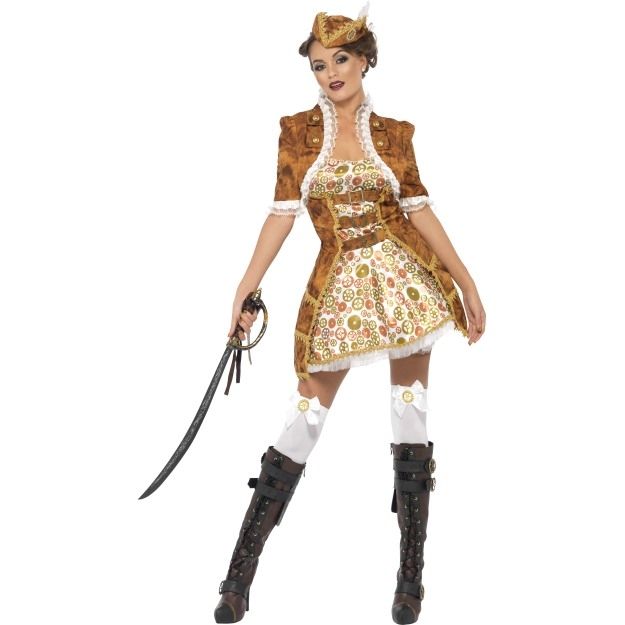 Костюм пиратки Стим панк выполнен в коричнево-золотистых цветах. Костюм включает в себя атласное блестящее платье с прикрепленным пиджаком, а также мини-шляпку пиратки с тесьмой и белым перышком.