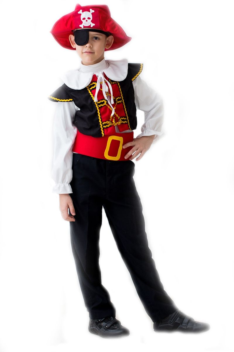 Костюм для детей Отважный пират включает в себя красную шляпу с изображением белого черепа, черная повязка на глаз, белый воротничок на завязках, белая рубаха, черный жилет с красной вставкой и красный пояс с желтой бляхой.