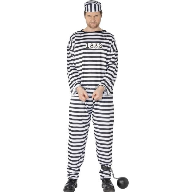 Полосатый костюм заключенного выполнен в черно-белом цвете и включает в себя полосатые брюки, футболку с длинными рукавами, а также шапочку.