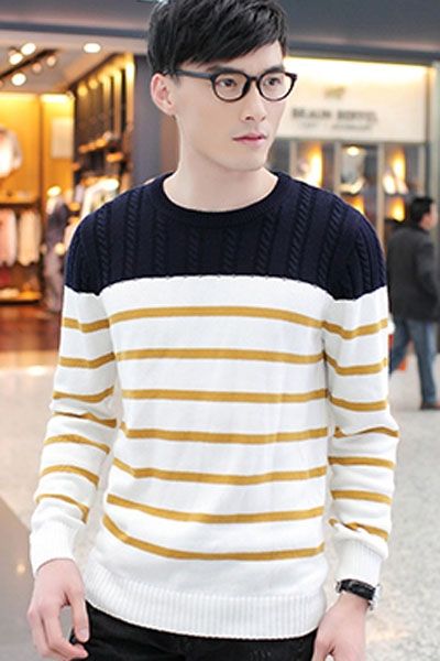 Мужской свитер в полоску подойдет для прохладной осенней погоды и зимы. Свитер выполнен из высококачественного хлопка. Светлый свитер разбавляют золотистые полоски, а также темная вставка сверху.