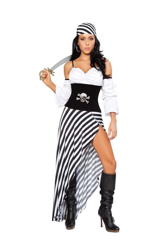 В комплекте костюма пиратской девушки имеется полосатая юбка, корсет с черепом, топ, отдельные рукава, пиратская бандана и меч.