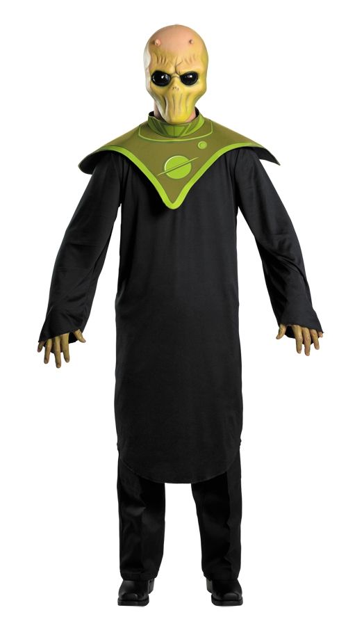 Костюм Инопланетное Вторжение включает в себя чёрную робу с прикреплённым воротником и маску. Штаны в комплект не входят. Такой костюм подойдёт для клубных вечеринок и подобных мероприятий.