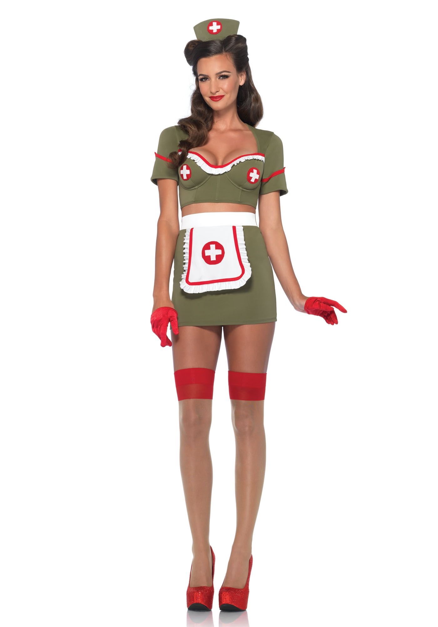 Ретро костюм армейской медсестры выполнен в темно-зеленом цвете. В комплект входит короткий топ с рукавами и глубоким декольте, топ украшен белыми рюшами и медицинскими крестиками на груди. Также в комплект входит короткая юбка с высокой талией, к юбке пришит белый передник с крестиком. Образ дополняет темно-зеленая мини-шляпка медсестры.
