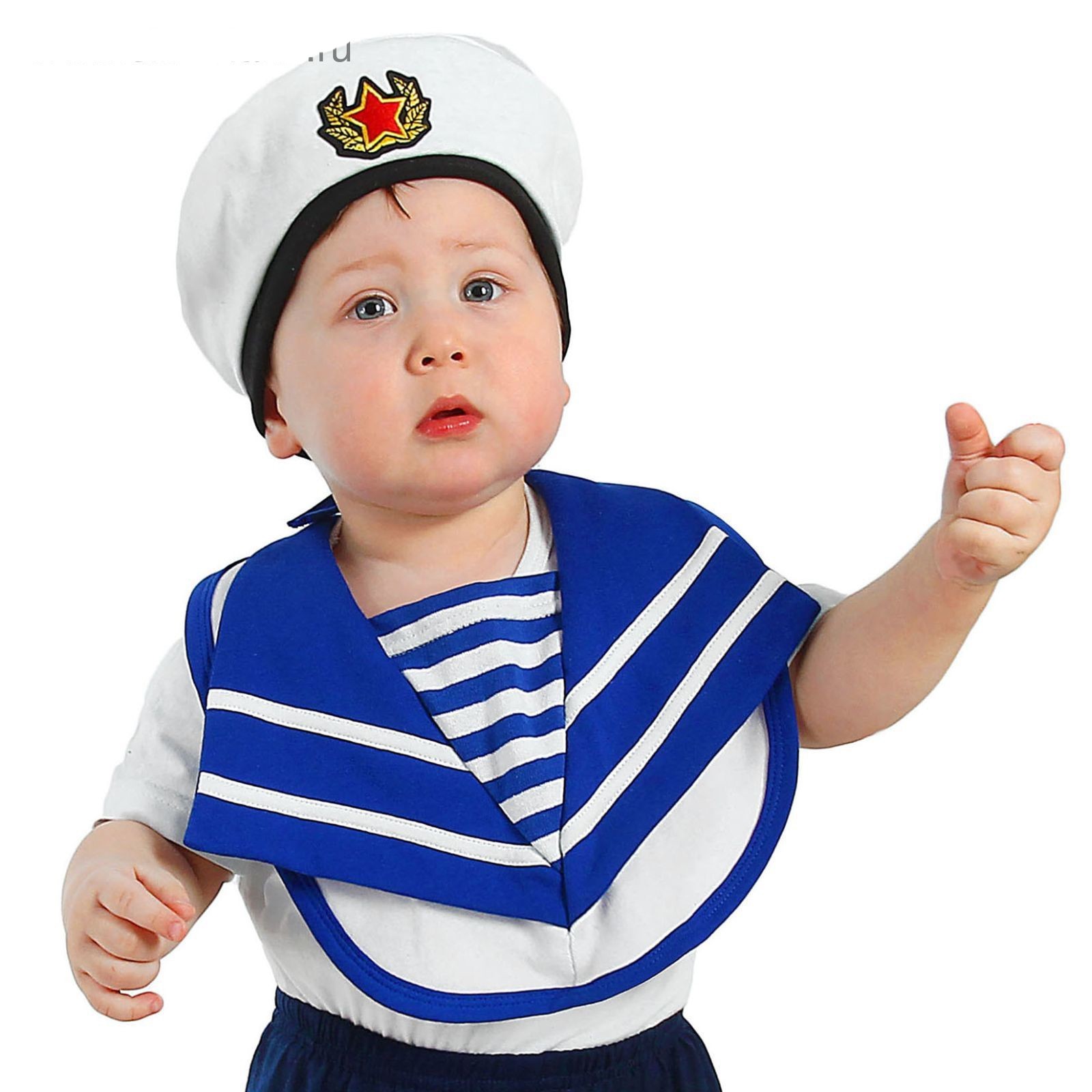 Набор для малышей ВМФ включает в себя сине-белый нагрудник, выполненный в виде морского воротничка. Также в комплект входит белая бескозырка с черной окантовкой и нашивкой.