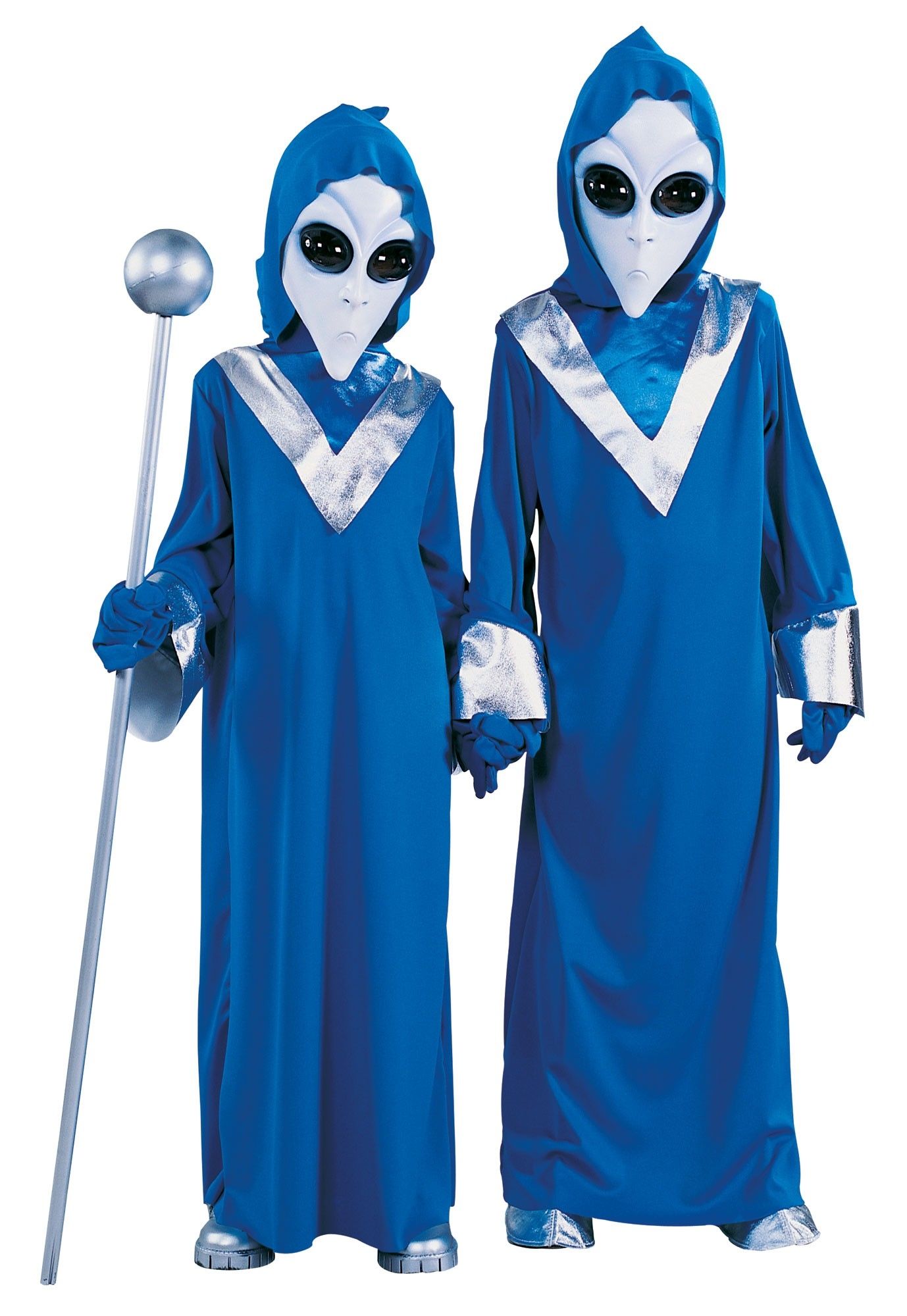 Детский костюм пришельца выполнен в синем насыщенном цвете. В комплект входит длинная мантия с серебряной блестящей вставкой на груди и блестящими манжетами. Также в комплекте имеется белая маска с вытянутым лицом и черными большими глазами и синие перчатки.
