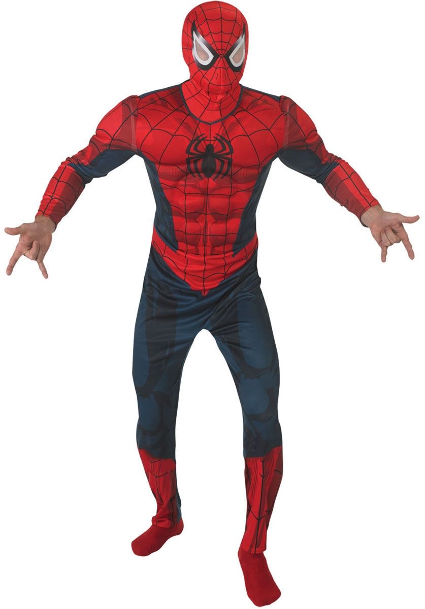 Костюм отважного Человека-паука состоит из классического комбинезона с застежками на липучках сзади и имитацией рельефа пресса и и плеч. Также в комплектацию данного костюма входит маска.