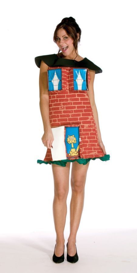 Платье Кирпичный дом - это короткое платье, расцветка которого выполнена в виде кирпичного здания, также имеются окошки и открывающаяся дверь, за которой сидит кошечка.