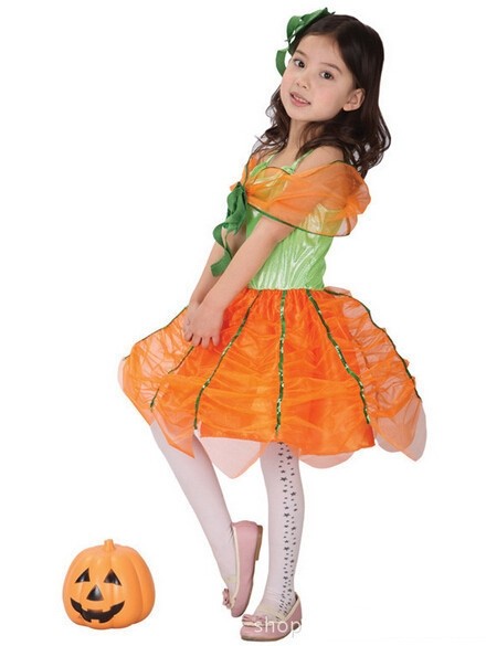 Детский костюм тыквочки - это яркое зелено-оранжевое платьице с пышной юбочкой и зеленым бантиком на груди. Также в комплекте аккуратный зеленый головной убор.