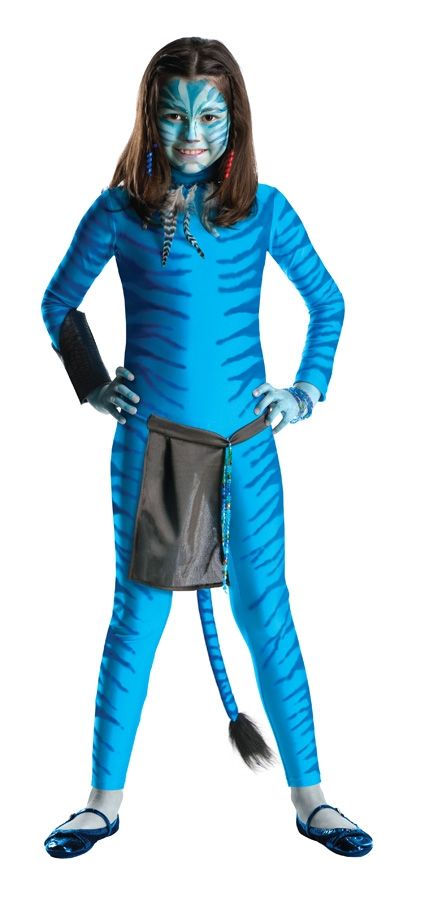 Детский костюм Аватара Нейтири - это синий эластичный комбинезон с темными полосками и прикрепленным длинным хвостом. К нему прилагается черный фартук.