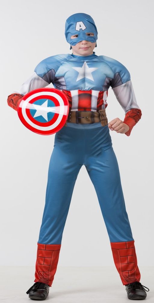 Костюм отважного Капитана Америки поможет отважному защитнику добра и порядка перевоплотиться в любимый образ. В состав данного костюма входит комбинезон в классической расцветке супергероя, маска и щит. Враги падут в любом количестве при одном виде такого героя и зло будет наказано.