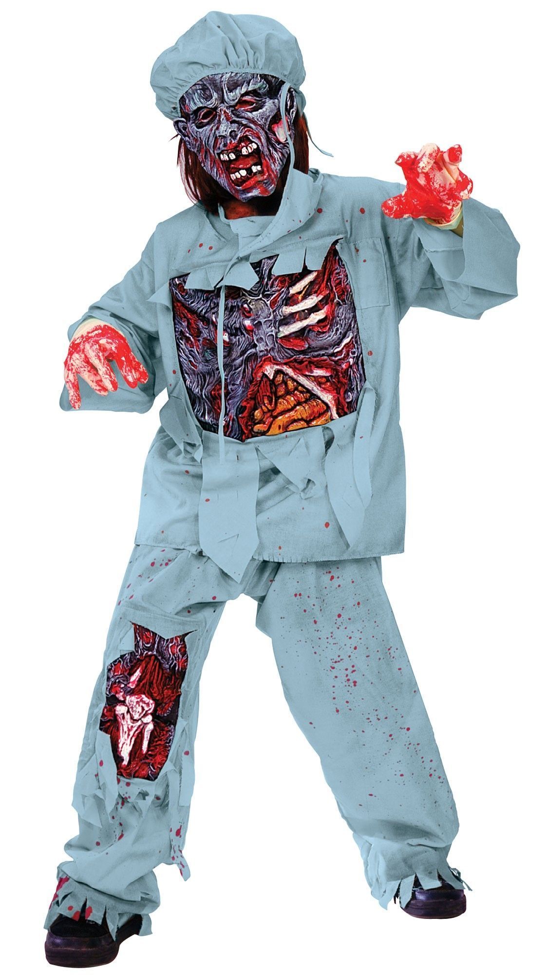 Детский костюм Зомби доктора выполнен в светло-голубом цвете. В комплекте имеется кофта с огромной дыркой посередине из которой виднеется грудная клетка и внутренние органы, штаны с дыркой и торчащей косточкой, медицинская маска на пол лица, перчатки, а также маска со сморщенным и окровавленным жутким лицом и медицинская шапочка.