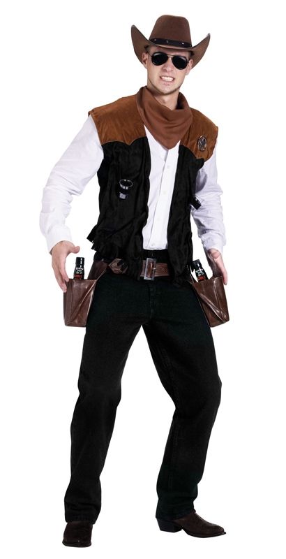 Костюм строгого шерифа состоит из чёрно-коричневого жилета с нагрудным знаком, из шейного платка, двух рюмок и ремня с чехлами для бутылок. Этот костюм прекрасно подойдёт для тематических вечеринок, карнавалов и маскарадов. В этом наряде вы будете выглядеть весьма привлекательно и вам будете уделено немало внимания.