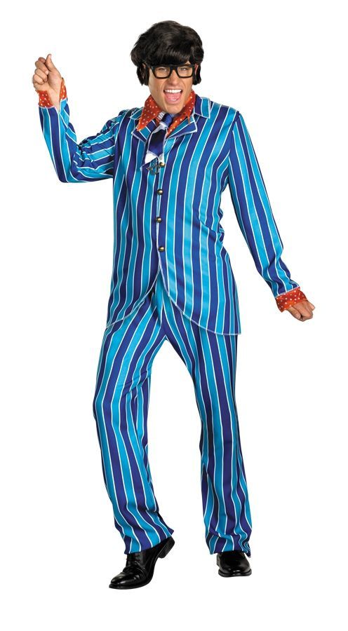 Костюм Остина Пауэрса включает в себя полосатый пиджак, брюки, рубашку, галстук и очки. Парик в комплект не входит. Такой наряд пригодится для выступлений, маскарадов и тематических вечеринок.