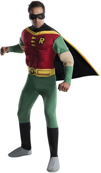 Костюм Робина Dlx - это костюм, который представляет образ одного из героев комиксов DC Comics. В комплект входит зеленый комбинезон с красным верхом и рельефными мышцами груди, также к комбинезону прикреплены черные накладки на сапоги. Также имеется желтый пояс, плащ и черная маска на глаза.