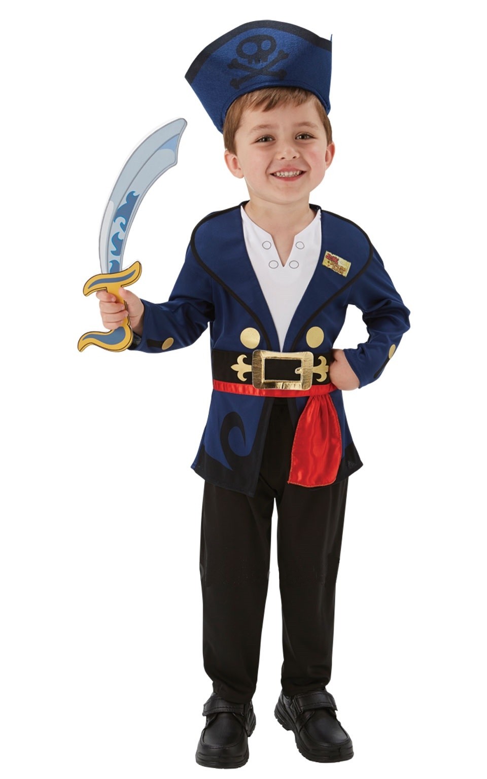 В комплект входит пиджак с имитацией белой рубашки под ним, черные брюки свободного кроя, пиратская синяя шляпа с эмблемой и сабля.
