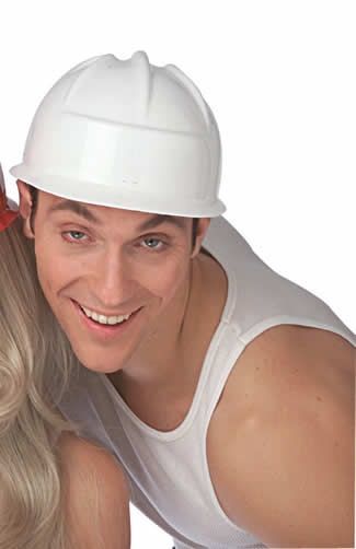 Белая строительная каска выполнена из легкого пластика. Она станет хорошим дополнением к костюмам строителей, пожарных и др.
