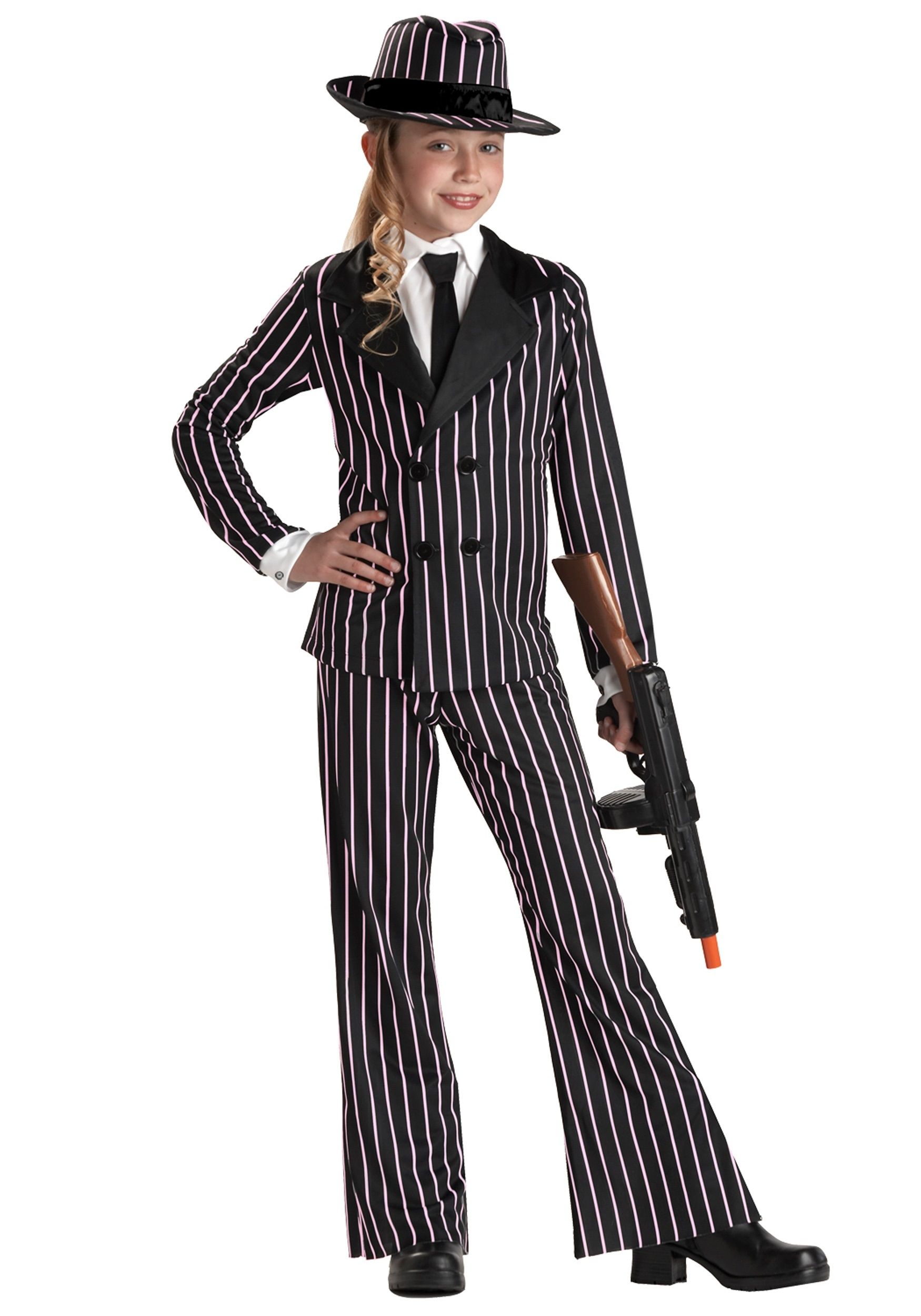 Подрастающее поколение элегантной "преступности" не разочаровало бы адептов давно минувших уличных войн ни наружностью, ни характером. В костюм входят: пиджак, брюки, шляпка, манишка и галстук.