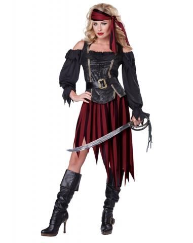 Костюм пиратки королевы включает в себя жилет с пришитыми длинными рукавами, юбку с неровным зубчатым подолом, черный пояс, а также красную повязку на голову.