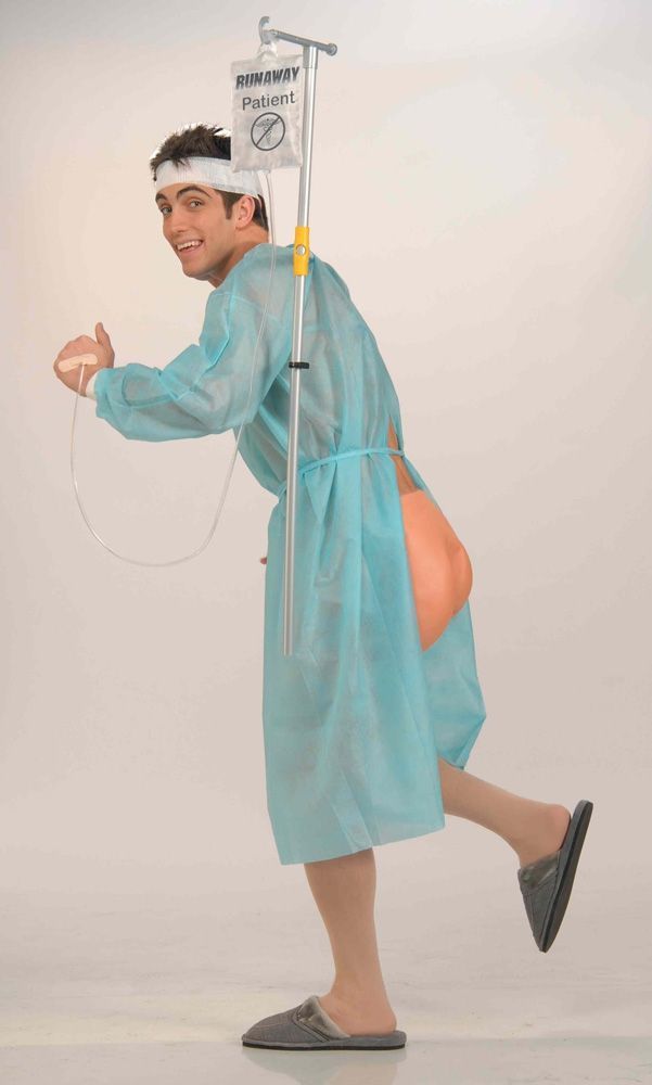 Костюм сбежавшего пациента включает в себя полупрозрачный голубой халат с открытой задней частью, прикрепленную капельницу с жгутами и накладную голую попу. Этот забавный костюм сможет повеселить каждого. Его можно надет на тематическую вечеринку и другие мероприятия.