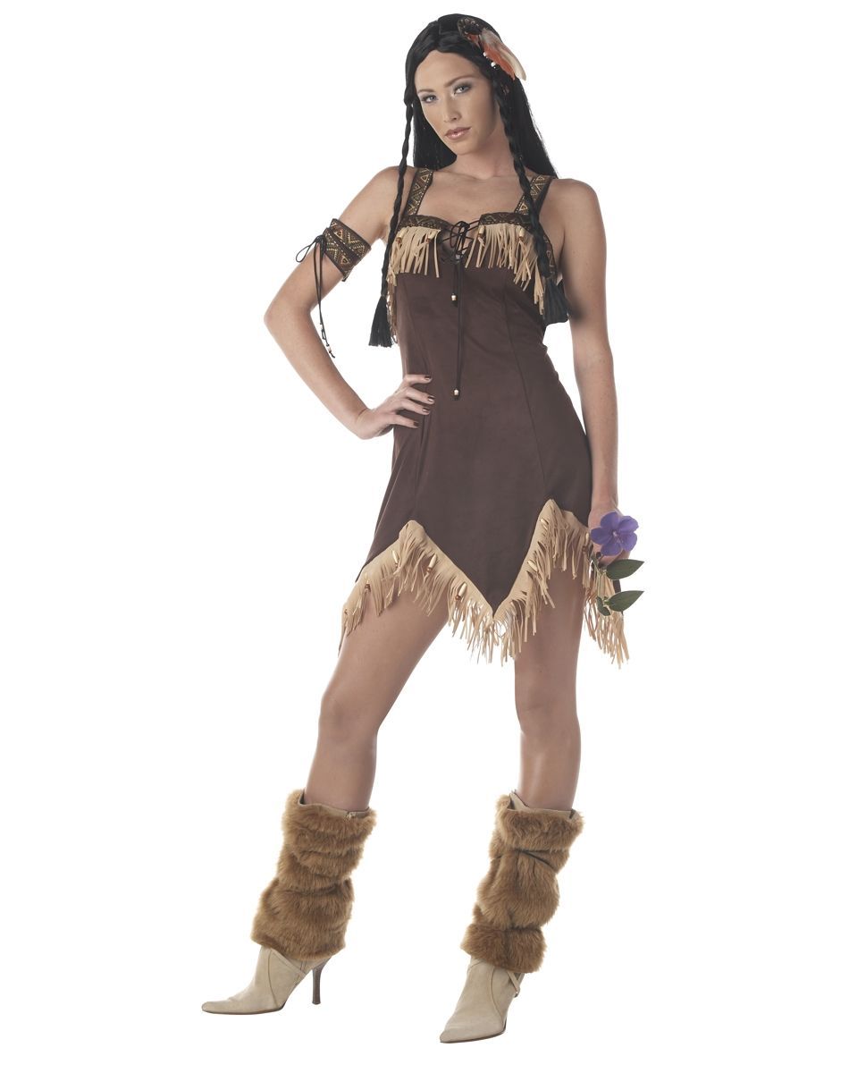 Мужской половине её родного племени очень непросто соблюдать супружескую верность. В костюм спелой девушки индейца входят: платье с бахромой, перо, повязка на руку, накладки на обувь.