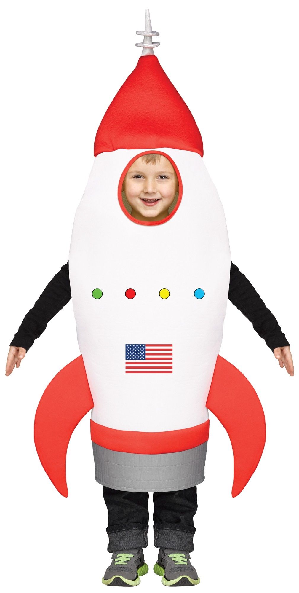 Детский костюм Ракета представляет собой тунику в виде ракеты белого цвета с красной отделкой. В тунике есть прорези для рук и прорезь для лица.