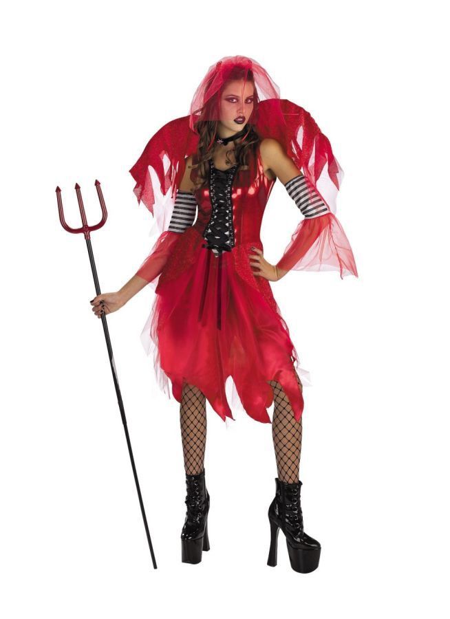 Костюм Феи-Дьявола включает в себя красное платье, нарукавники, рваные крылья и рожки с вуалью. Трезубец в комплект не входит, но его можно приобрести отдельно, а также другие аксессуары, которые дополнят ваш загадочный огненный образ.